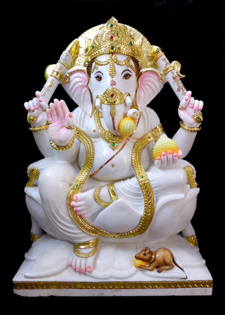 This image shows a beautifully crafted marble idol of Lord Ganesha, adorned with gold detailing and jewels. Seated gracefully, he holds traditional symbols like the Modak, with his mouse companion at his feet, symbolizing wisdom, prosperity, and devotion.